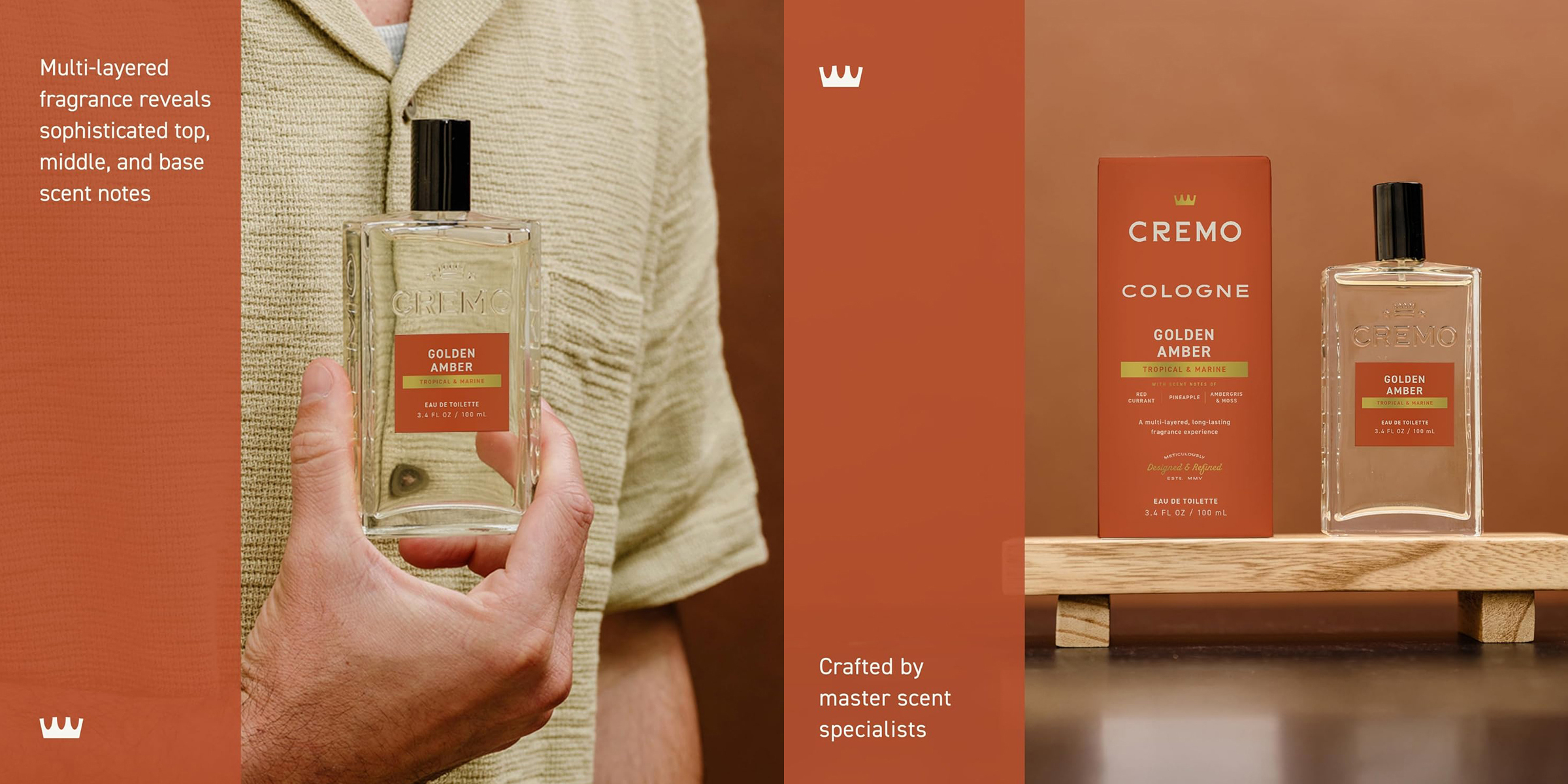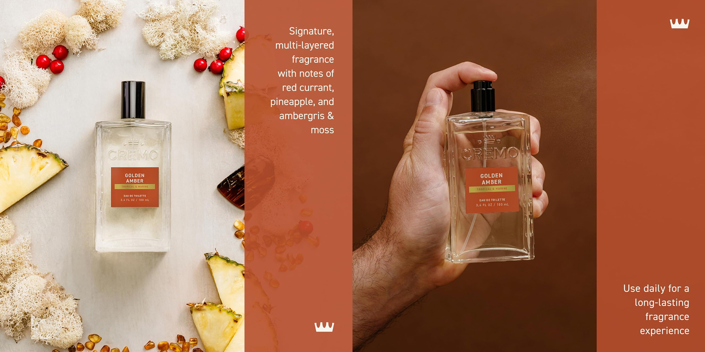 Cremo 黃金琥珀 男性古龍香水(Golden Amber)採用木質調搭配海洋調為基底,調和金色琥珀、龍涎香、水生氣息、苔蘚、紅醋栗、鳳梨...等,營造出異國度假風情般的奢華氣息,時尚迷人的個性香氛,散發從容自信的瀟灑魅力。