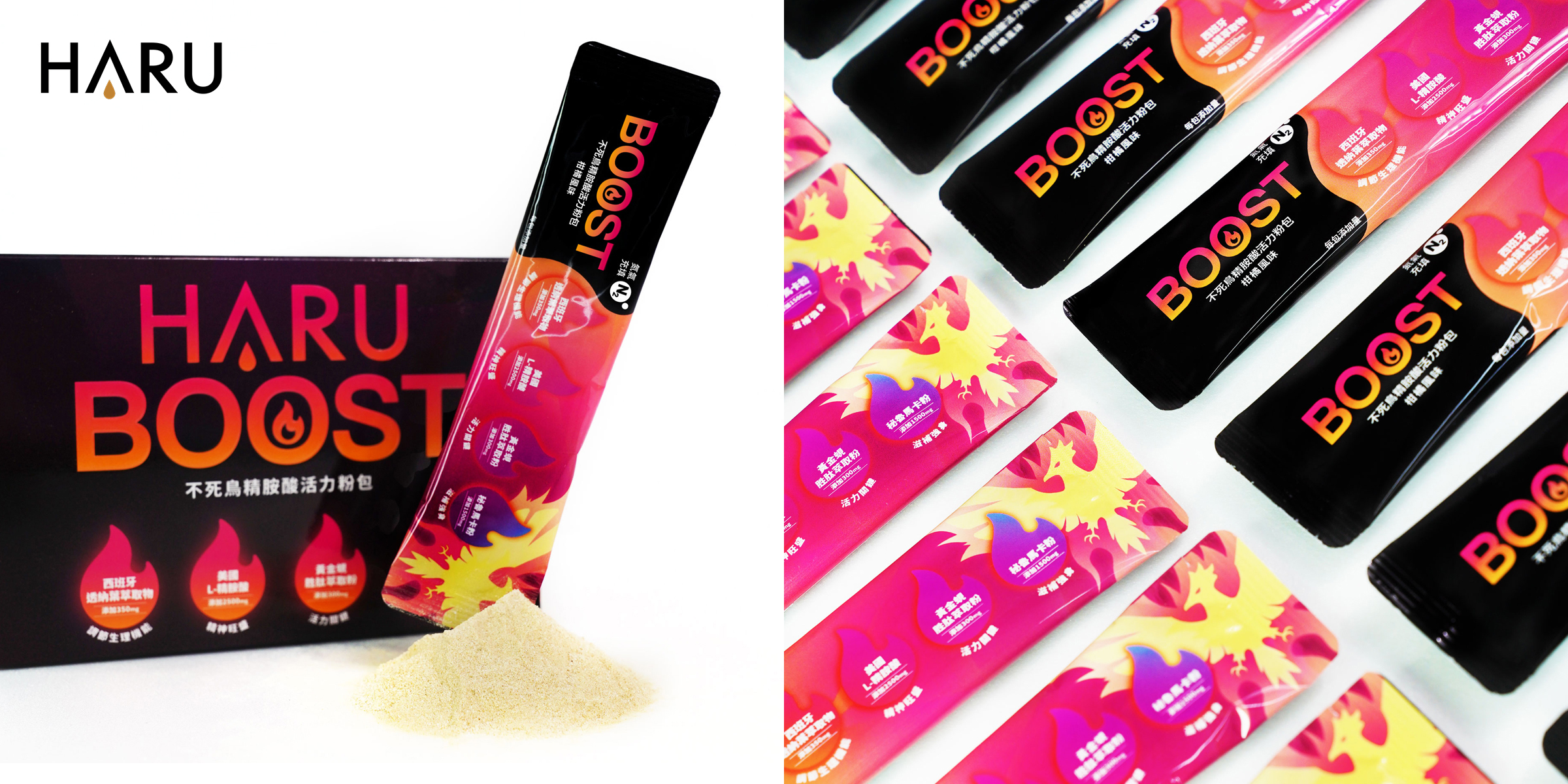 Haru Boost 不死鳥精胺酸活力粉,採用高純度、高濃度成份,研製六大配方最佳比例,氮氣充填粉包,擁有一級吸收效率,給予高強度的營養補給,快速補充、提升精力、滋補耐力、調節生理機能,關鍵時刻有感靠得住。