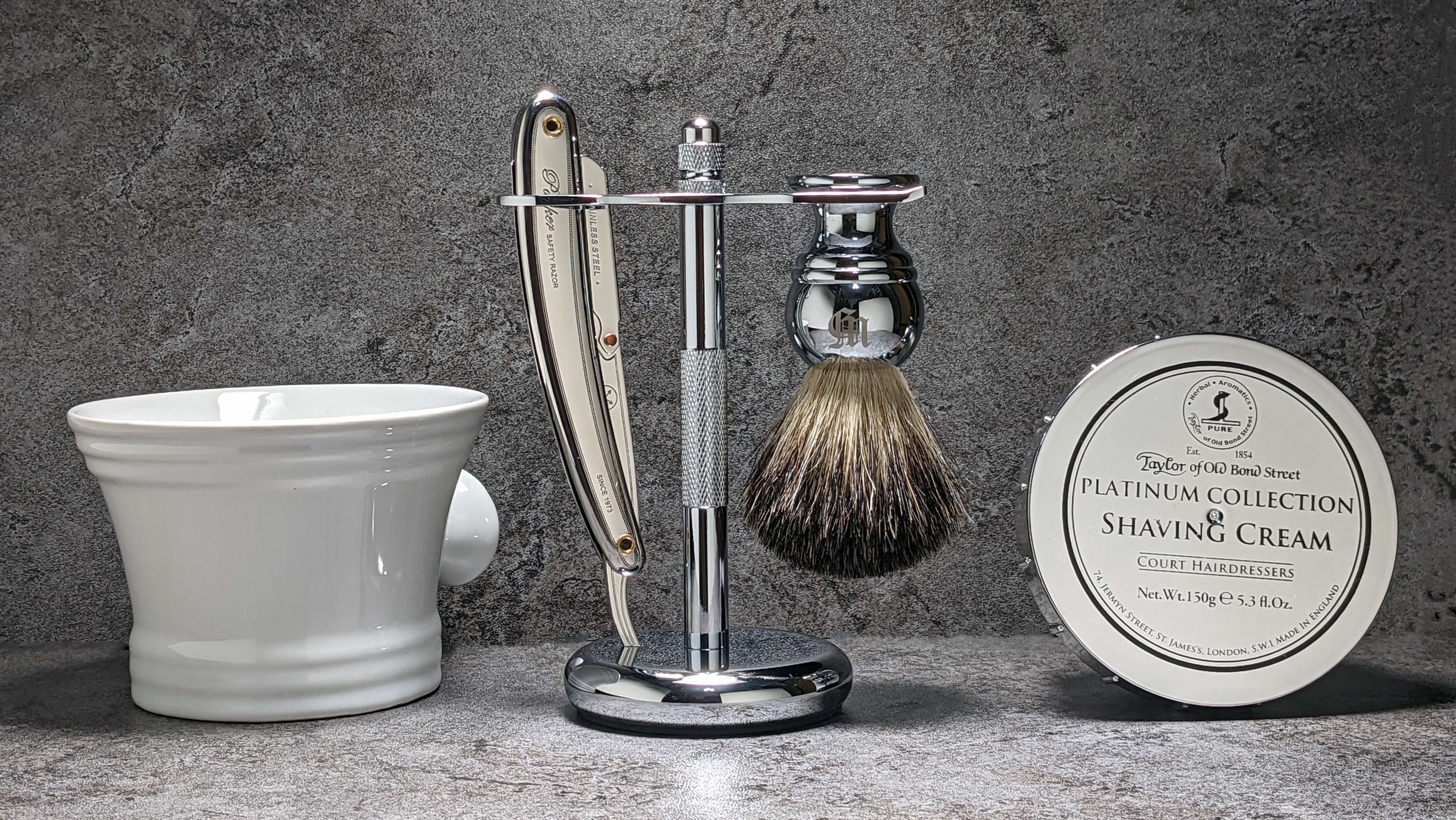 組合內容:Parker SR1 經典款 直式剃刀、Grand Manner 純獾毛刮鬍刷(銀)、Grand Manner 剃刀收納架