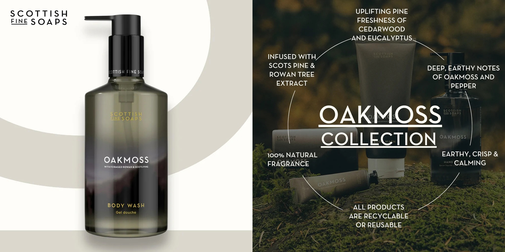 The Scottish Fine Soaps 皇家橡樹 沐浴露(Oakmoss Body Wash),為品牌最新香氛洗沐保養系列,選用高品質原物料成分、天然香氛素材,溫和親膚的配方,適用於所有膚質(敏感肌、痘痘肌...等皆適用),豐富綿密細緻的泡沫,能夠溫和深層的潔淨肌膚,洗淨髒污汗垢、去除體味汗臭,添加蘇格蘭松樹萃取、花楸萃取、乳酸、天然精油...等成分,清潔的同時能夠護理肌膚,維持肌膚控油保濕、皮脂平衡,洗後肌膚清爽舒適不乾澀、不敏感搔癢,採用溫潤舒心的木質調香氛為基底,散發著橡木苔、雪松、琥珀的氣息,令人療癒放鬆的香氣,如同身處皇家橡樹園,感受晨曦陽光灑落於林木間的優雅寧靜氛圍,沐浴後彷彿充滿了大自然芬多精,身心靈都能夠感到舒緩與元氣。