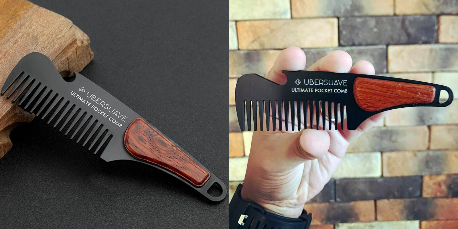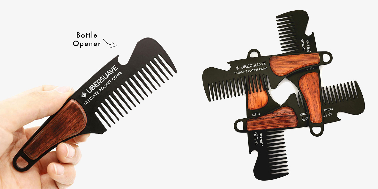 Ubersuave 金屬多功能隨身口袋梳,採用合金材質,經過黑色霧面消光噴砂處理,梳子堅硬耐用不易變形、不生鏽,手柄搭配檀香木做拼接,梳子的齒尖經過精密圓頭處理,滑順圓潤好梳理、不刺激頭皮,恰到好處的尺寸設計,方便隨身攜帶,也能適用多種男士髮型做梳理,同時齒梳的另一面設計為開瓶器,絕對是偶爾想要來一瓶啤酒的男士們的隨身必備小物。